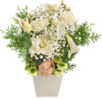Voici une coupe de plantes hivernales qui fleure bon l’arrivée tant attendue du printemps. Entre bleu glacial et blanc givré, le rosier et la jacinthe dominent naturellement cette création originale que votre destinataire pourra conserver dans la durée, sur un balcon, une terrasse, sous une véranda ou dans un jardin.