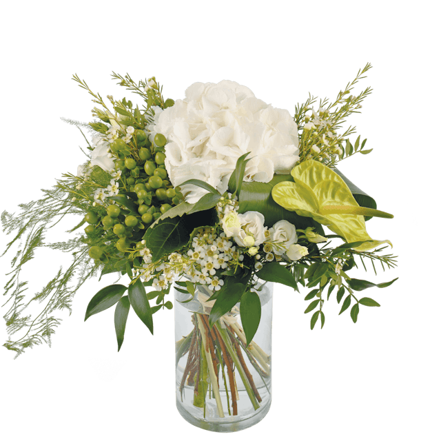 Avec son design moderne et original, notre bouquet Diamant vous invite à transmettre votre message avec élégance pour marquer vos proches dans la durée. Une création forale à dominante blanc et vert emmenée par les fleurs variées, l'anthurium, l'hortensia, le lisianthus, l'aspidistra et l'asparagus, fleurs et feuillages emprunts de pureté et de générosité.