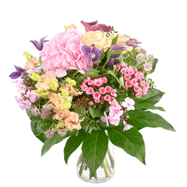 Pour fleurir vos plus belles occasions, les fleuristes créateurs de la marque Interflora vous invitent à découvrir notre bouquet Féerie. Composée avec des roses, lisianthus, hortensias, clématites et autres fleurs variées aux couleurs rose, bleu, pêche et parme, cette création champêtre et décorative promet un très bel effet, au bureau comme à la maison.